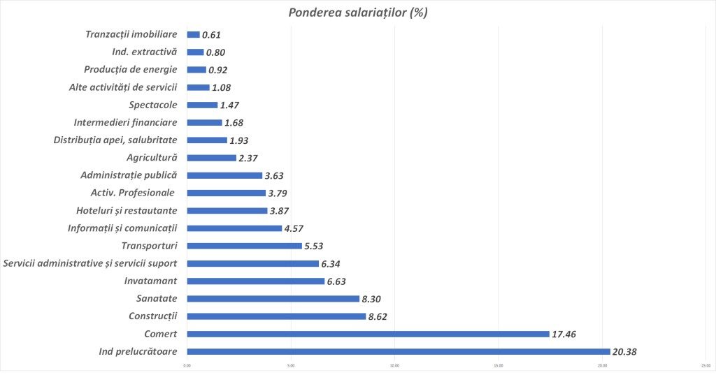 Cele mai mari salarii s-au regăsit în domenii precum IT și comunicații (cu 90,1% peste media pe economie), bănci și asigurări (63,6%) și energie (58,0%). La polul opus, hotelurile și restaurantele, alte servicii, imobiliare, agricultura și sectorul cultural au avut valori sub media națională, uneori chiar cu peste 40% mai puțin.