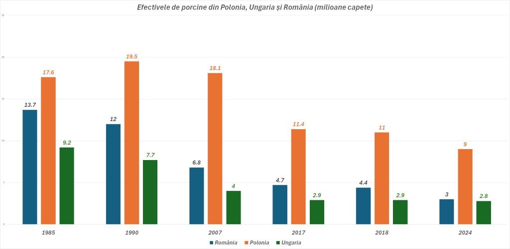 În 1985, efectivele de porcine din România erau de aproape 14 milioane de capete. Astăzi, ele cu coborât la circa 3 milioane, potrivit unui comunicat transmis luni de Statistică.