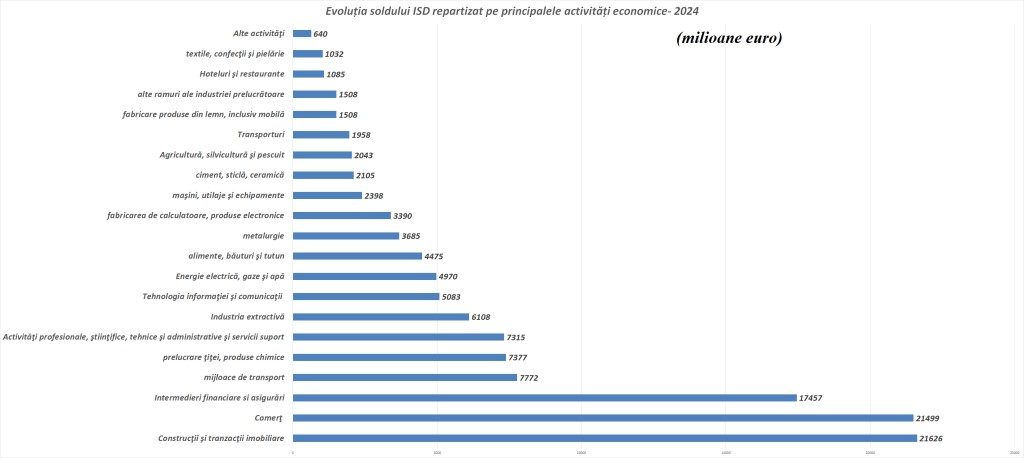 Patru sectoare economice dețin acum 85,5% din stocul total net de ISD al României, subliniind o concentrare îngrijorătoare a capitalului străin. Industria conduce cu 37,1% din investițiile totale, produsele prelucrate reprezentând 28,2% din această cifră. Construcțiile și tranzacțiile imobiliare captează 17,3%, în timp ce comerțul și intermedierea financiară asigură 17,2%, respectiv 14%.