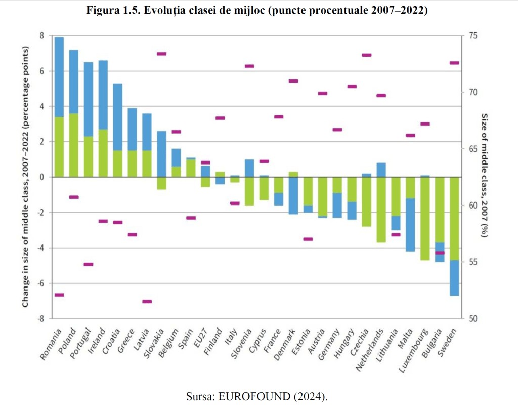 Același studiu Eurofound (2024) arată că în ceea ce privește clasa de mijloc, în majoritatea statelor membre aceasta s-a redus în perioada 2007-2022.