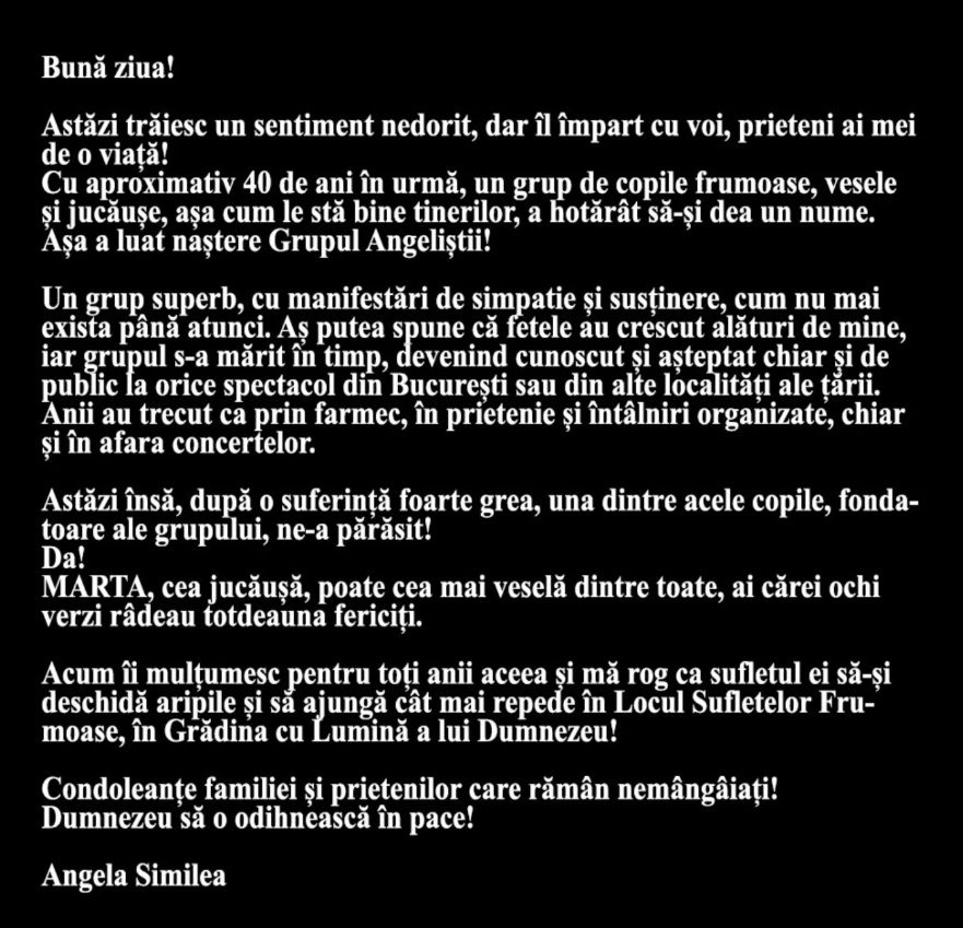 „Astăzi trăiesc un sentiment pe care nu mi l-aș fi dorit niciodată. Cu patru decenii în urmă, câteva adolescente vesele și pline de viață au format Grupul Angeliștii. Fete minunate, care m-au urmat peste tot prin țară și mi-au oferit sprijinul lor sincer și necondiționat. În timp, au crescut alături de mine, iar relația noastră s-a transformat într-o prietenie de-o viață. Una dintre ele, Marta, o fire mereu jucăușă, cu ochii ei verzi și zâmbetul cald, ne-a părăsit după o lungă suferință. Îi mulțumesc pentru toți acești ani frumoși și mă rog ca sufletul ei să ajungă în Grădina cu Lumină a lui Dumnezeu”, a scris artista.