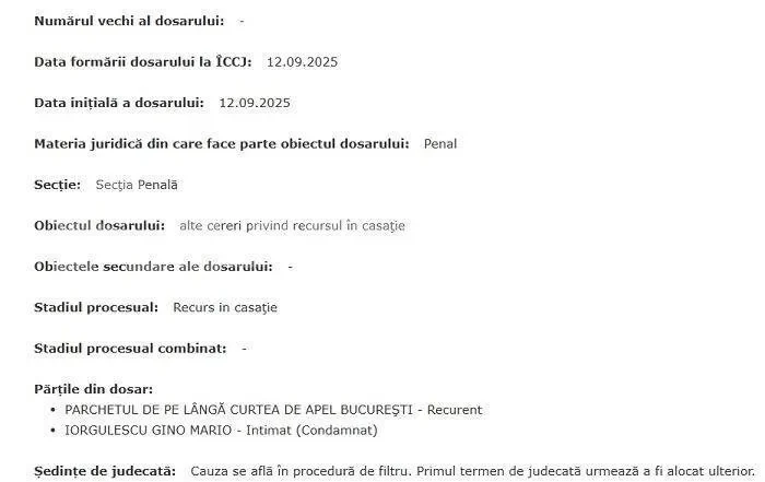 În urmă cu câteva zile, procurorii au apelat la recursul în casație și cer ca Iorgulescu că rămână cu pedeapsa inițială. Deocamdată dosarul a fost înregistrat, iar după analizarea documentelor se va stabili un termen.