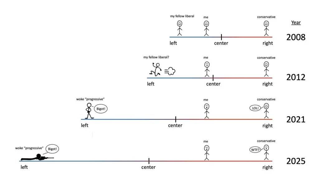 Mulți care se descriu astăzi ca „moderați”, „liberali clasici”, „centriști” spun același lucru: nu și-au mutat reperele; harta din jur s-a rotit. E efectul bărcii care plutește pe râu: stă pe loc în raport cu malul din mintea ta, dar apa — curentul cultural — te duce în aval.